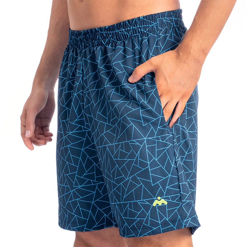 Seu design moderno traz estampa geométrica em azul, que garante um visual descontraído e versátil. O cós elástico com cordão interno ajustável oferece segurança e conforto, enquanto os bolsos laterais garantem praticidade para carregar pequenos itens.